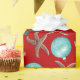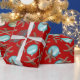 Tropical Christmas gift wrapping paper with starfish, sea horses and aqua blue ball ornaments design printed over holiday deep red colour.