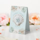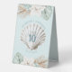 This Table number sign has a watercolor image of a white sea shell with the bride and groom's name and wedding date. Colours used include, slate blue, forest green, ivory and tan.