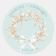 This sticker has a watercolor image of a starfish sea shell wreath with the bride and groom's name and wedding date. Colors used include, slate blue, forest green, ivory and tan.