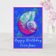 A pretty Nautilus spiral sea shell sits in front of a beautiful ocean royal blue background. Bright turquoise starfish float within the rich blue. The sea shell is light rose pink, fuchsia, turquoise, and midnight Navy blue. The greeting inside the card reads: May your years ahead be filled with happy days. Happy Birthday! The recipient's name is under the seashell on the front of the card. Blue starfish are inside and on the back of the card. The back also has a template for the month and year.