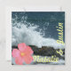 Tropical beach save the date with waves splashing against the shore, coral pink hibiscus and fun bold text. Perfect way to announce an upcoming destination wedding by the sea.
