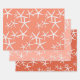 White starfish pattern wrapping paper sheets in set of three. White sea stars in various sizes are scattered over coral pink-orange paper in three shades. The beach themed design works for a tropical Christmas, graduation, birthday, housewarming and just about any occasion.
