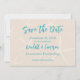 Starfish save the date wedding announcements. Beige background is covered in white sea stars on horizontal 5x7 inch paper that offers many upgrades. Text templates are lagoon blue-green colour. Names used can be first only, or full, if they fit. Reverse is also covered in sea star images on tropical blue.