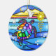 A brightly coloured sea turtle done in a stained glass style, swims towards the shining sun as a dove of peace flies overhead and a sail boat glides through the water in the distance.