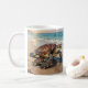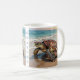 A coastal themed personalised coffee mug with an illustration of a mama sea turtle and baby crawling into the blue ocean waves on a sandy beach. Just add a name or family member such as "grandma" in the personalise area.