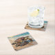 A coastal themed coasters with an illustration of a mama sea turtle and baby crawling into the blue ocean waves on a sandy beach.