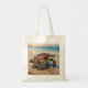 A coastal themed tote bag with an illustration of a mama sea turtle and baby crawling into the blue ocean waves on a sandy beach.