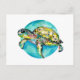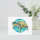 traditional watercolor artwork of a colourful sea turtle swimming along in front of a blue coloured circle on a postcard