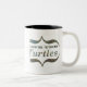 Coffee mug says Save the Turtles. Other side has image of swimming sea turtle.