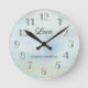 Wall clock featuring an artistic painted seafoam coloured design with (optional) gold and pale teal numbers.