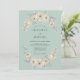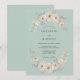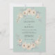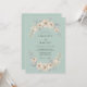This design features a serene seafoam green backdrop adorned with delicate watercolor illustrations. Soft cream roses and peach blossoms are nestled among dusty blue eucalyptus and silvery foliage. The ethereal colour palette creates a peaceful and romantic mood perfect for a spring or summer event. Elegant botanical elements wrap around the centre to create a graceful and sophisticated aesthetic.