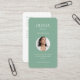 Modern and stylish business card featuring a QR code for social media, photo, tagline, enquiry details and social media links. Primary colours used in template are seafoam green and white. This versatile all-in-one-template can easily be updated. Replace circle photo with own profile photo or company logo. Your image will be adjusted automatically to fit into a circle shape. The design has a fresh & chic look and feel.