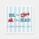 Boil on the beach! Seafood boil bachelorette weekend with a crab and lobster against a coastal blue striped background