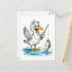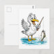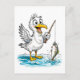 Illustration of a seagull standing in shallow coastal water while holding a fishing rod with a caught fish. Maritime setting with expressive character elements.