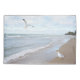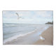 Two seagulls at the beach; one flying and one walking on the sand with puffy white clouds in the sky.