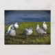 This postcard features six grey and white seagulls gathered on the green grass on a sunny day at the shore of Cayuga Lake. The inviting blue water is just beyond them. Cayuga Lake is the longest of central New York's glacial Finger Lakes. The city of Ithaca is located at the southern end.