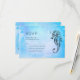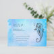 Wedding RSVP card with a black ink sketch of a seahorse and a seashell. The background is a pretty blue watercolor texture.