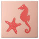 Mixed media digital rendition of a seahorse and starfish in deep coral orange against a light coral orange background