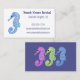 This fun beach-themed business card is perfect for promoting vacation home rentals and other ocean-themed and holiday-themed businesses. Features a cute cartoon illustration of a seahorse in light blue with your info in bold, clear navy blue. The reverse side has three cartoon seahorses against a navy blue background.