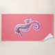 A stylised seahorse with vibrant pink and purple hues stands out against a dark background. It features an intricate design with patterned scales and a curled tail that suggest a whimsical and artistic interpretation.