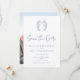 This classic minimal white and dusty blue wedding save the date card is perfect for coastal and nautical themed and beach destination weddings, with 2 cute seahorses kissing at the top, trendy handwriting script, and a photo template on the back.