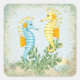 Two colourful aqua and yellow tropical Seahorses with tails twined in seaweed. Glitter print border with sand, seashore and waves background. Delightful beach and sea life theme.