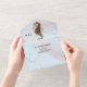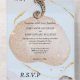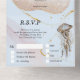 A beautiful all-in-one woodland watercolor invitation featuring a brown and emerald seahorse and jelly fish with long flowing tentacles surrounded by faux rose gold glitter set against a pastel blue background infused with pale pink and printed gold leaf sparkles. The bottom third has a tear off response card with personalised rsvp address and dusty topaz background for your guests to complete. These are ideal for beach theme wedding celebrations; tropical coastal island anniversary parties and marine themed events.
