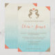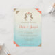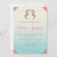 Tropical theme wedding invitation card design featuring two sand brown seahorses facing each other with a heart in coral pink colour between them. The background colour is light blue to off white gradient with some light stripes pattern on it. As an extra detail each corner of this invitation has either beige or coral pink colour to it.