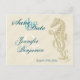 Let all your family and friends know to save the date with this summery seahorse card. Card is fully customisable and features a seahorse impression in the sand design. All lettering, the bride & groom's names, the wedding date and all pertinent information, is in two coordinating shades of blue.