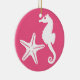 Mixed media digital rendition of a seahorse and starfish in white against a deep coral pink background