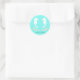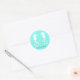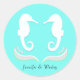 Stylish round beach theme wedding sticker, with graphics of two white sea horses facing each other, on an aquamarine background. Black script text is ready to personalise. Lovely finishing touch to our Seahorses Modern wedding invitations.