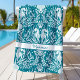 This personalised coastal beach towel features a damask style pattern with seahorses, seaweed, coral and shells, in a teal and white colour scheme.