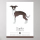 Destei's original cartoon illustration of a seal brown and white coat colour Italian Greyhound breed dog. There are three personalizable text areas where one could be for the name of the pet, one could be for the breed and another one could be for a few personality traits. The text is separated with a stylish border including a dog paw print in the middle. On the bottom there is a line of colour that matches the colour of the dog.