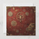 An ornate emblem glows in gold against a textured crimson backdrop, surrounded by arcane symbols and cryptic inscriptions.