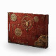 An ornate emblem glows in gold against a textured crimson backdrop, surrounded by arcane symbols and cryptic inscriptions.