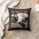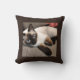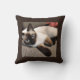 Throw pillow in an illustration of a beautiful seal point Siamese cat lounging on a couch, rendered as a digital watercolor effect portrait