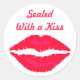 White sticker with red and hot pink lipstick imprint of lips and "Sealed with a kiss" above.
