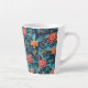 A beautiful latte mug with a seamless paper floral pattern against a blue background.