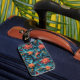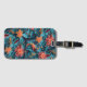 A beautiful luggage tag with a seamless paper floral pattern against a blue background.