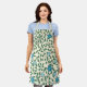 Seamless floral pattern with blue flowers, green leaves, and twisting vines on a light beige background. The design is lively and decorative.