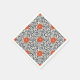 Seamless floral pattern with vibrant orange flowers and navy blue leaves on a beige background, creating an ornate, symmetrical design.