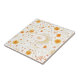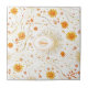 This seamless pattern ceramic tile features stylised golden suns with radiant lines in varying sizes, set against a crisp white background. Scattered throughout are abstract floral and star-like shapes in warm orange and gold tones, connected by swirling golden lines that create a flowing, energetic rhythm. Bright and decorative, this design evokes warmth, positivity, and a dynamic celestial aesthetic—perfect for sunny, bohemian, or mystical-inspired themes.