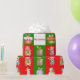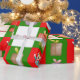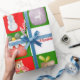 A seamless pattern with illustrations showing images with a Christmas theme. The images are of wrapped gifts, snowmen, and Christmas bears. The pattern has nine sections with alternate red and green backgrounds and a white one in the center. The center panel has the words Merry Christmas written in red on it.