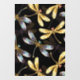 Seamless pattern with gold, jewellery, shiny dragonflies with detailed, sparkling wings on black background. Gold dragonfly.