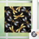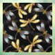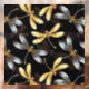 Seamless pattern with gold, jewellery, shiny dragonflies with detailed, sparkling wings on black background. Gold dragonfly.