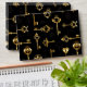 Seamless pattern of antique, gold and silhouette keys on black background.
