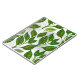 Seamless pattern of green patterned tea leaves and sprouts on a light background. Tea design.