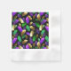 Seamless pattern of bright purple, green, and gold feathers on black Mardi Gras background. Design for the Mardi Gras holiday.