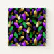 Seamless pattern of bright purple, green, and gold feathers on black Mardi Gras background. Design for the Mardi Gras holiday.
