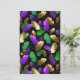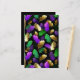 Seamless pattern of bright purple, green, and gold feathers on black Mardi Gras background. Design for the Mardi Gras holiday.